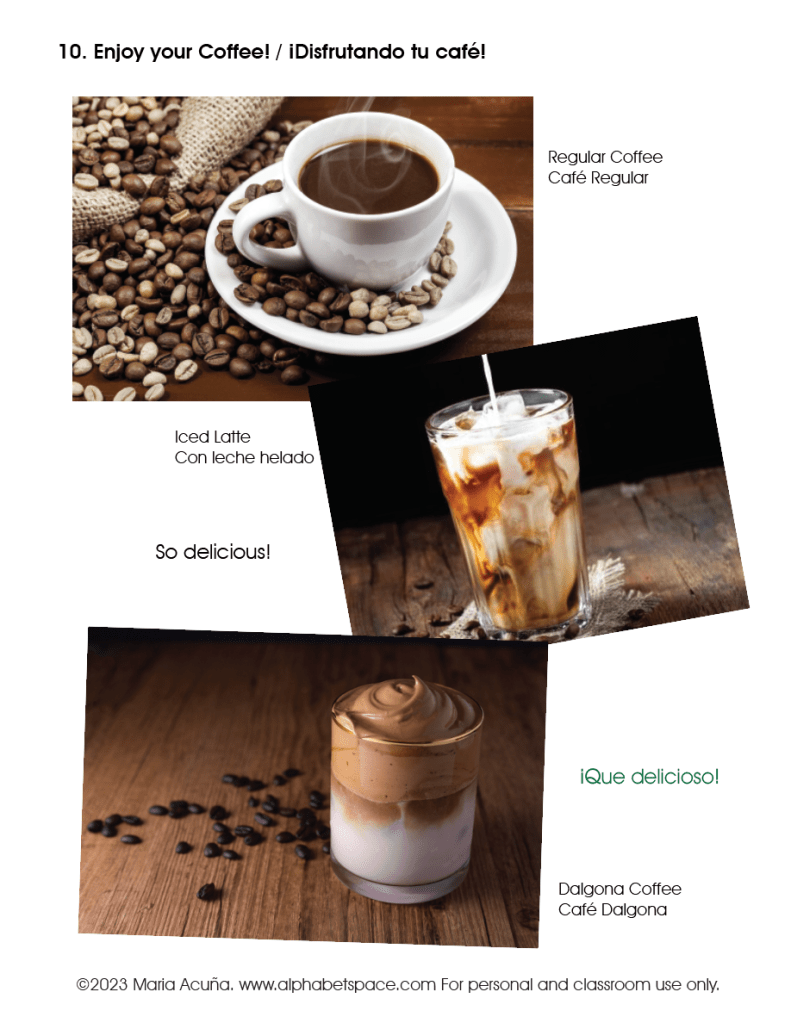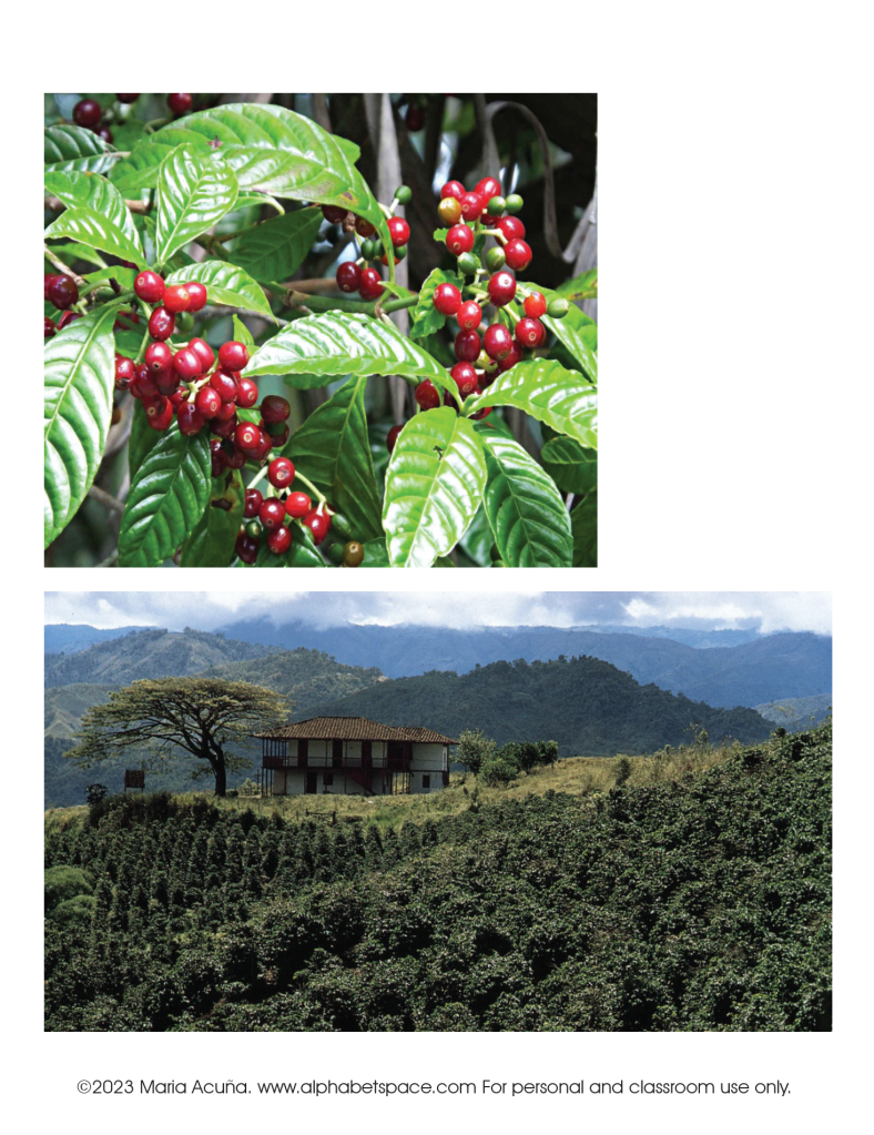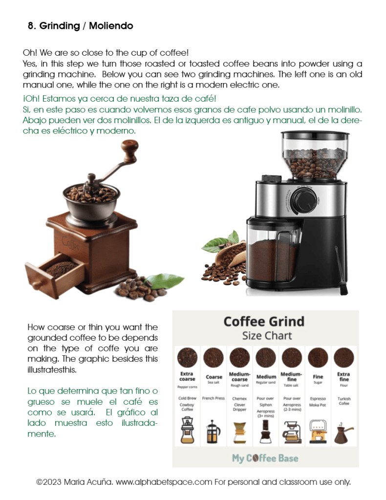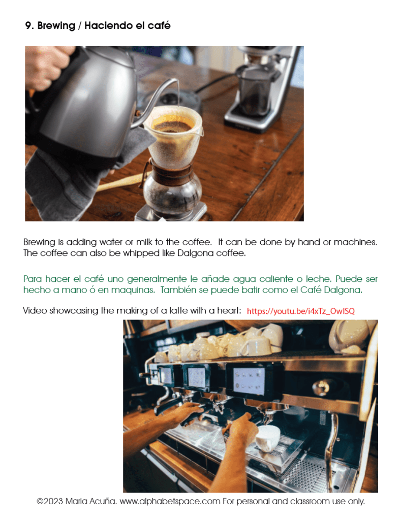 Below you will find 2 PDF’s. One is about coffee in general and has photos and its history in English. The second PDF is 9 pages long and is a photo essay of how a cup of coffee is made. It is bilingual English/Spanish, in case you want to go over some of the steps in Spanish. You can project these PDFs as you show kids the real coffee or print it all out in card stock or paper. If you are using paper (this is what we did) set the videos included in the PDF on different tabs in your laptop or tablet so you can show the kids without wasting time. Videos really enhance what is being said beyond the photos.