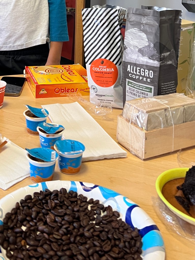 3. We showed students the coffee beans and the ground coffee as we talked about it. The smell in the room was so coffeelicious! We also had the obleas with arequipe! Obleas are a popular giant wafer cookie that you add arequipe (dulce de leche) to. It goes down with coffee very well and your students will love it! It’s on the third photo to the right. ^ ^