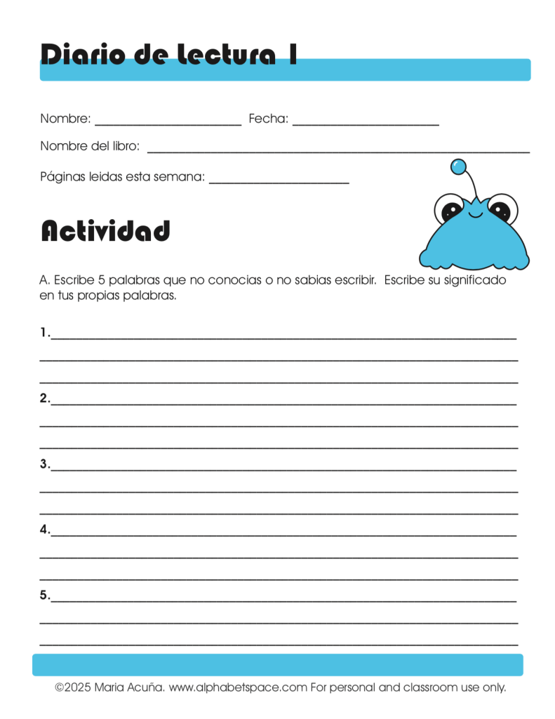 One thing I’m trying this year is having them read a book in Spanish at home. I think this is a wonderful way to have students develop their vocabulary and read more fluently in Spanish. Every week they will fill in a reading diary that includes an activity they have to do based on what they read. These activities are nor reading comprehension questions, they are grammar related. See some below: