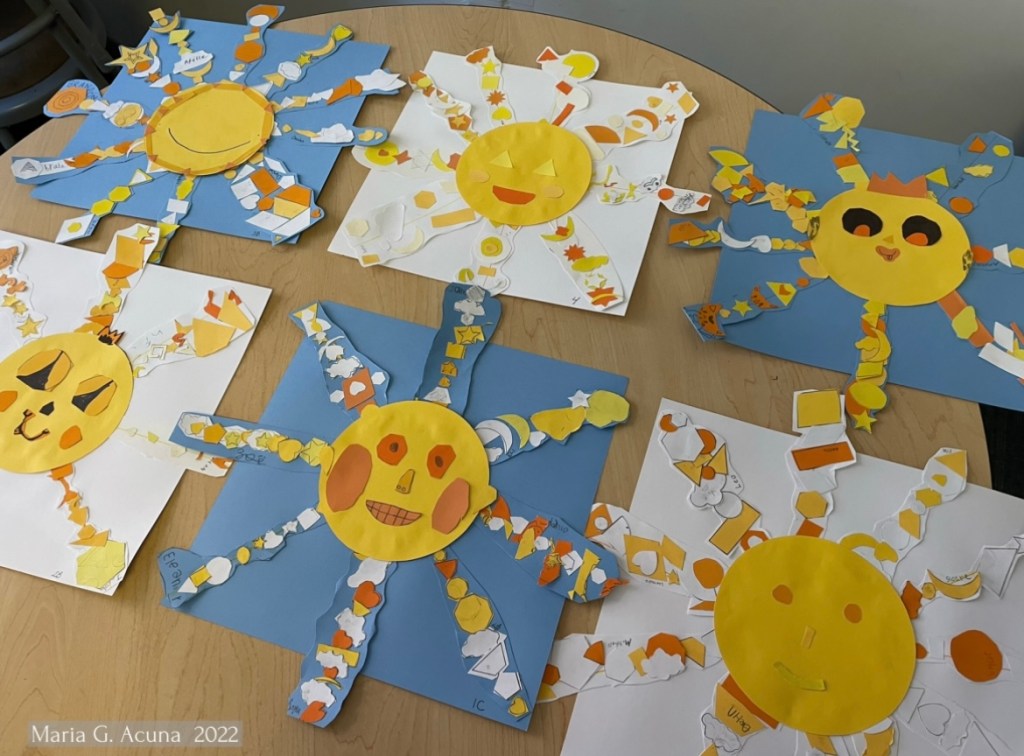 I decided to have every ten kids or so create a sun together. This would yield 24 suns that could be displayed checkers board style. I would use scrapbook sized paper 12 x 12″. Some would be over that sky blue and others over white. But how? What would each kid do? Well they would each get to make their own ray of sunshine! And help with a feature for the face fo the sun too.