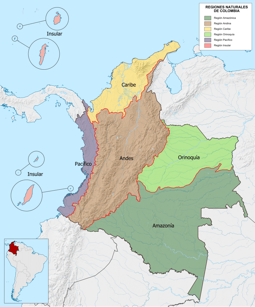 Colombia can be divided into six distinct natural regions: the Andean Region, covering the three branches of the Andes mountains found in Colombia; the Caribbean Region, covering the area adjacent to the Caribbean Sea; the Insular Region, comprising the islands in both the Atlantic and Pacific Oceans, the Pacific Region adjacent to the Pacific Ocean, the Orinoquía Region, part of the Llanos plains mainly in the Orinoco river basin and finally, the Amazon Region, part of the Amazon rainforest. See the map below: