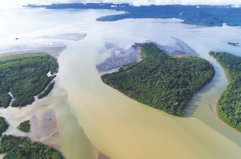 From Cabo Corrientes north to Punta Ardita and on into Panama the Baudó Mountains meet the ocean in steep cliffs, rising up to as high as 70 m (230 ft), with small indentations in the coast providing small pocket beaches, some sandy, but most are shingle or cobble. However, near river mouths the coast has been eroded and there are wide sandy beaches, tidal flats and even mangrove swamps.