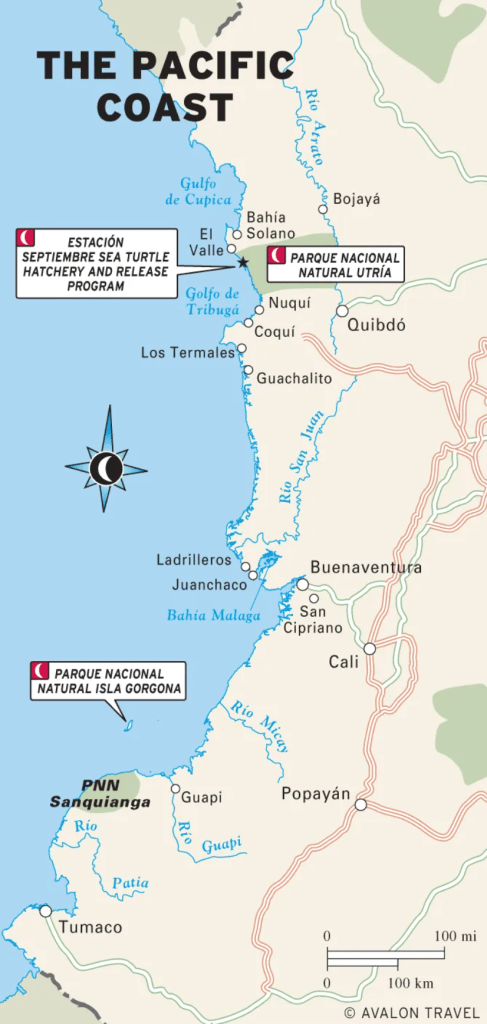 In this region there are the very narrow and discontinuous Pacific coastal lowlands, which are backed by the Serranía de Baudó, the lowest and narrowest of Colombia’s mountain ranges. The Serranía del Baudó is separated from the West Andes by the Atrato valley where the Atrato River flows and Quibdó is located. From the south the range extends from the Baudó River north and slightly west along the coast into Panama terminating at the Golfo de San Miguel. The range is called Serranía del Sapo when it is in Panama. Technically the landform extends south of the Baudó River down to Malaga Bay, but the area has been eroded into low hills and marshlands. (1)