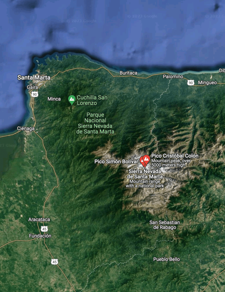 In the southern part rises the Sierra Nevada de Santa Marta, an isolated mountain system where the highest mountains of Colombia are. They are an impressive granitic massif that ascends abruptly from the Caribbean littoral to snow- and ice-covered summits. They rise to 18,947 feet (5,775 metres)! at the “twin peaks” of Cristóbal Colón and Simón Bolívar, the highest point in the country. There is a still an ongoing discussion about which mountain is higher, so some literature says it’s the Cristóbal Colón one and some say it’s Pico Simón Bolivar and then some say they are the same height hense the twin peak reference. To take you pick for the peak! ^ ^