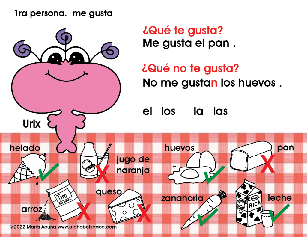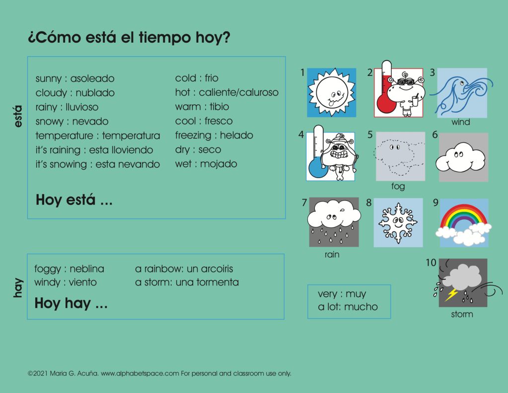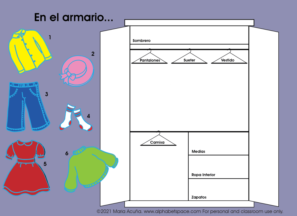 With this image I practice clothing items and their colors and where they go. I will point to a hanger and ask “¿Cuál es el sueter? Numero 2 o 6?” And the kids will say “número 6!” I will add “El sueter verde es el número 6.” to reinforce the sentence once more.