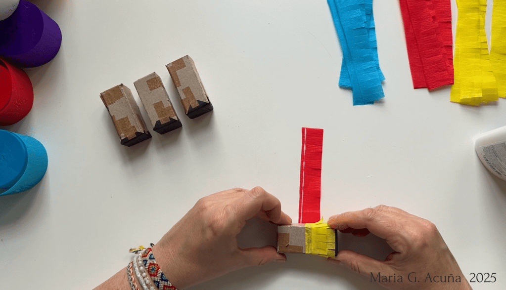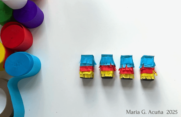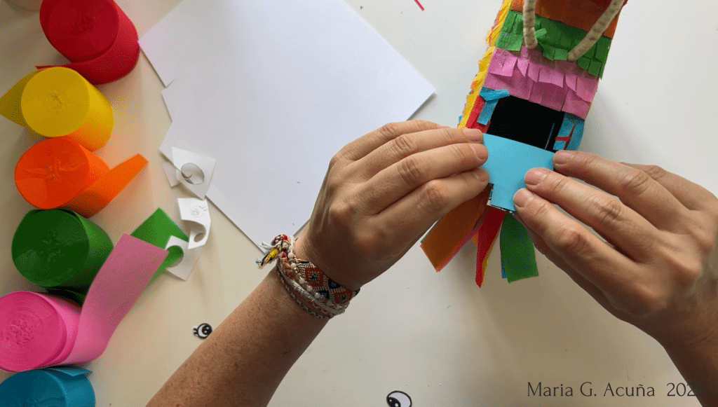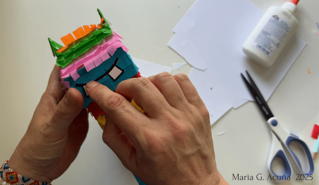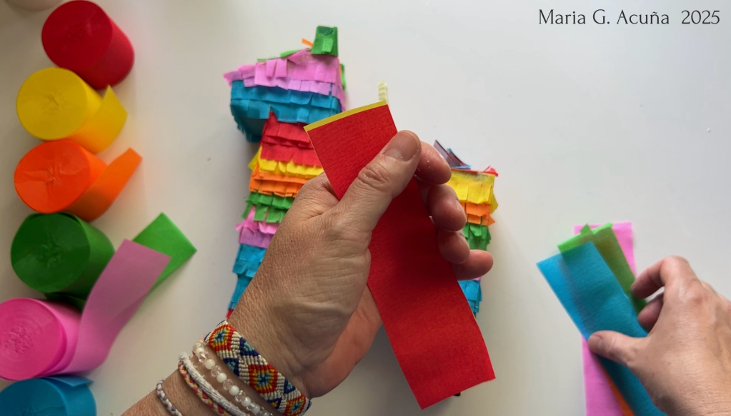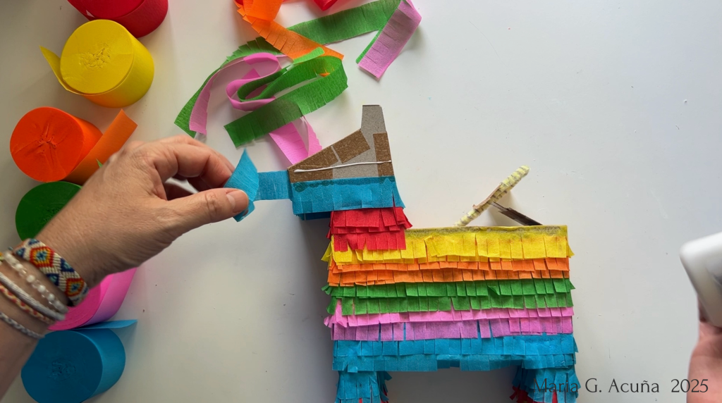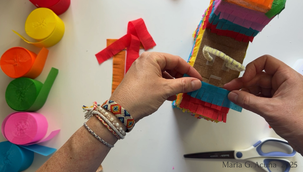 I decided to use crepe streamer rolls to decorate the piñata as I feel it is much easier to use than tissue paper because it comes in a smaller size. And with a class, they would be able to access it and measure it easier!