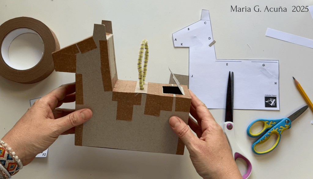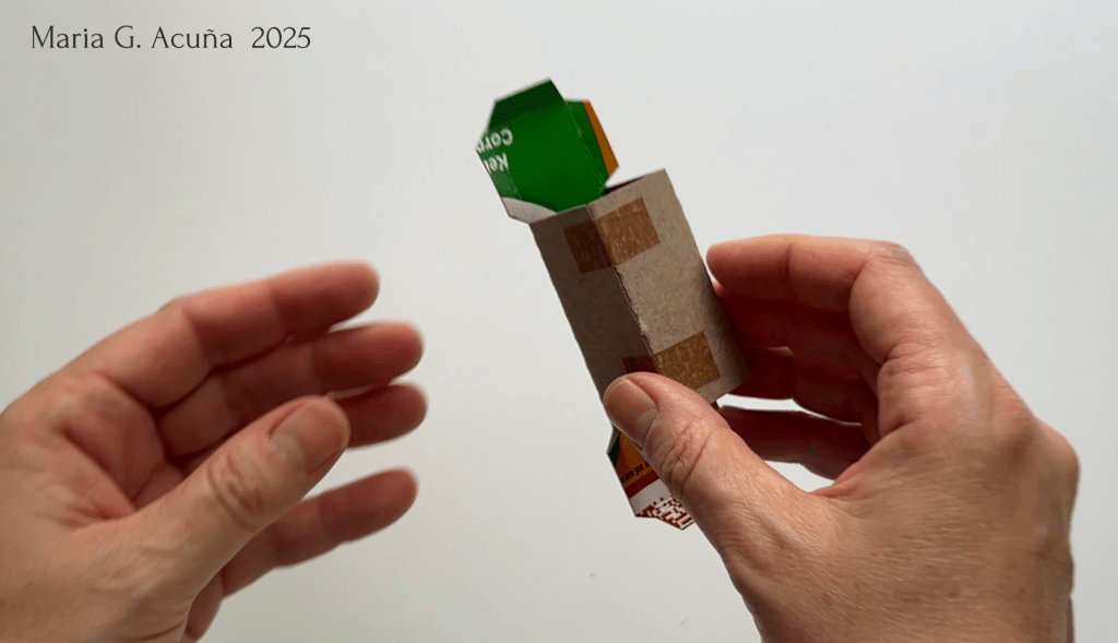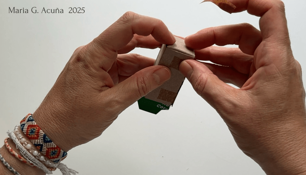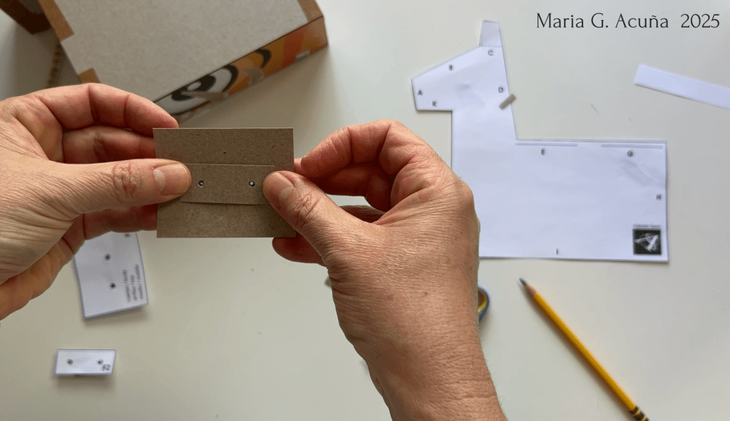 Then attach that twisted piece to the cardboard. (You’ll be taking it onto that smaller rectangle and the bigger piece.
