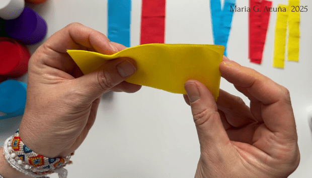 Measure the streamer around the leg to get an approximate of the needed length to decorate. Depending on your need, you’ll need 6 singles cut up papers for one leg (or 6 doubled). so in my case I had three colors on the legs so I needed 2 of each color per leg or 6 in total. Stacking is great as the paper becomes more sturdy and easier to hold.