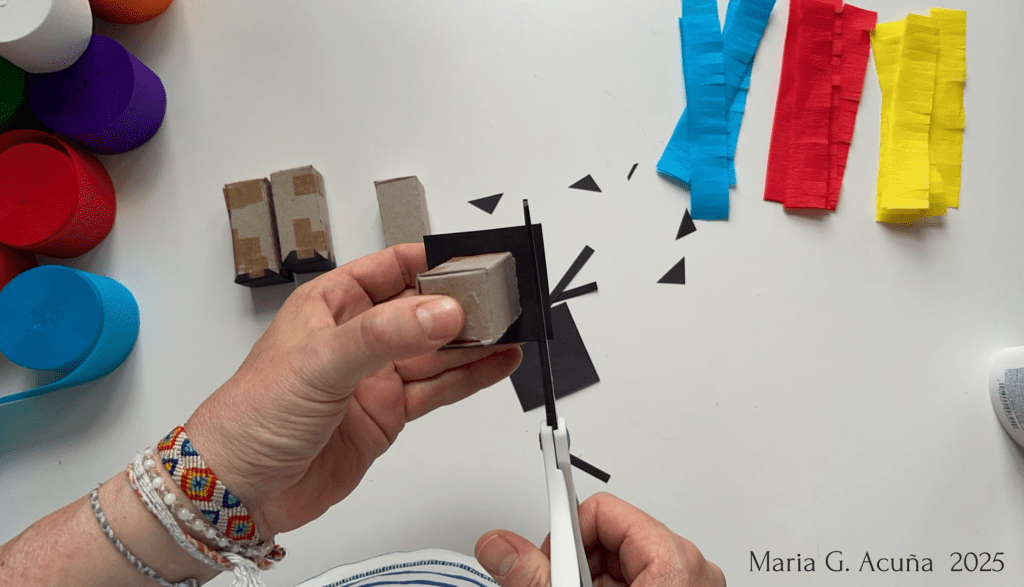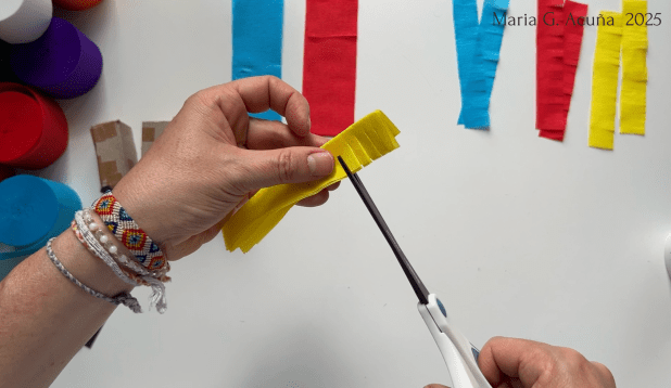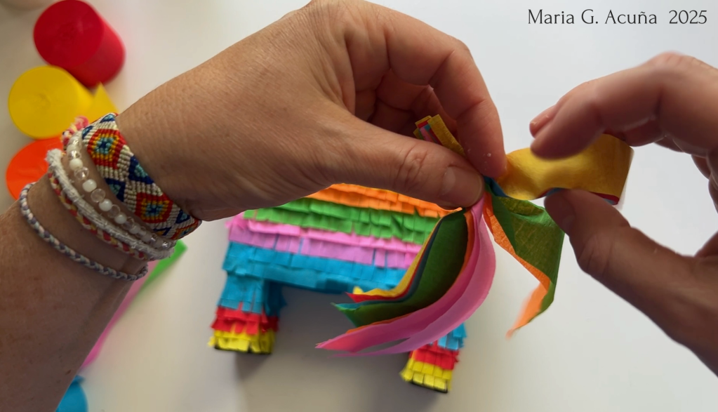 Start by measuring the crepe paper by wrapping the piñata (1 time). Cut about 6-8 strips of the same size. Then stack 3, fold them in half and make the little ruffle cuts all along them. Then cut these in half or use them doubled. See the video below, I cued it right on this part!