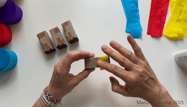 4. Then add a pipe cleaner to create a loop to hang the piñata. This part is the trickiest in the project. If you are a child make sure you get help from an adult. Use a scissors to poke the holes making sure you have another piece of cardboard underneath to protect the table.