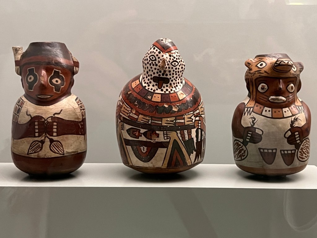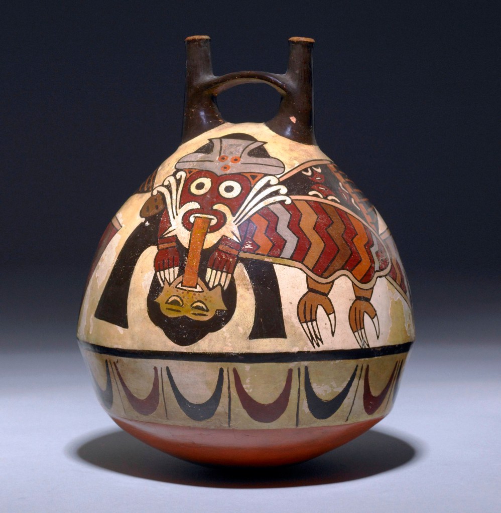 The Nazca were also known as the “Technicolor” potters because the number of colors used by Nasca artists is larger than that used by any other culture in the Americas before European contact. They mastered a palette of at least 15 bold colors made from mineral pigments. Unlike other groups, they used a “pre-fire” painting technique, applying their designs before the clay was baked to create a permanent, glossy finish that has lasted for thousands of years. They filled every inch of their ceramics with intricate images of nature, mythical killer whales, and shamans rarely living any free spaces.