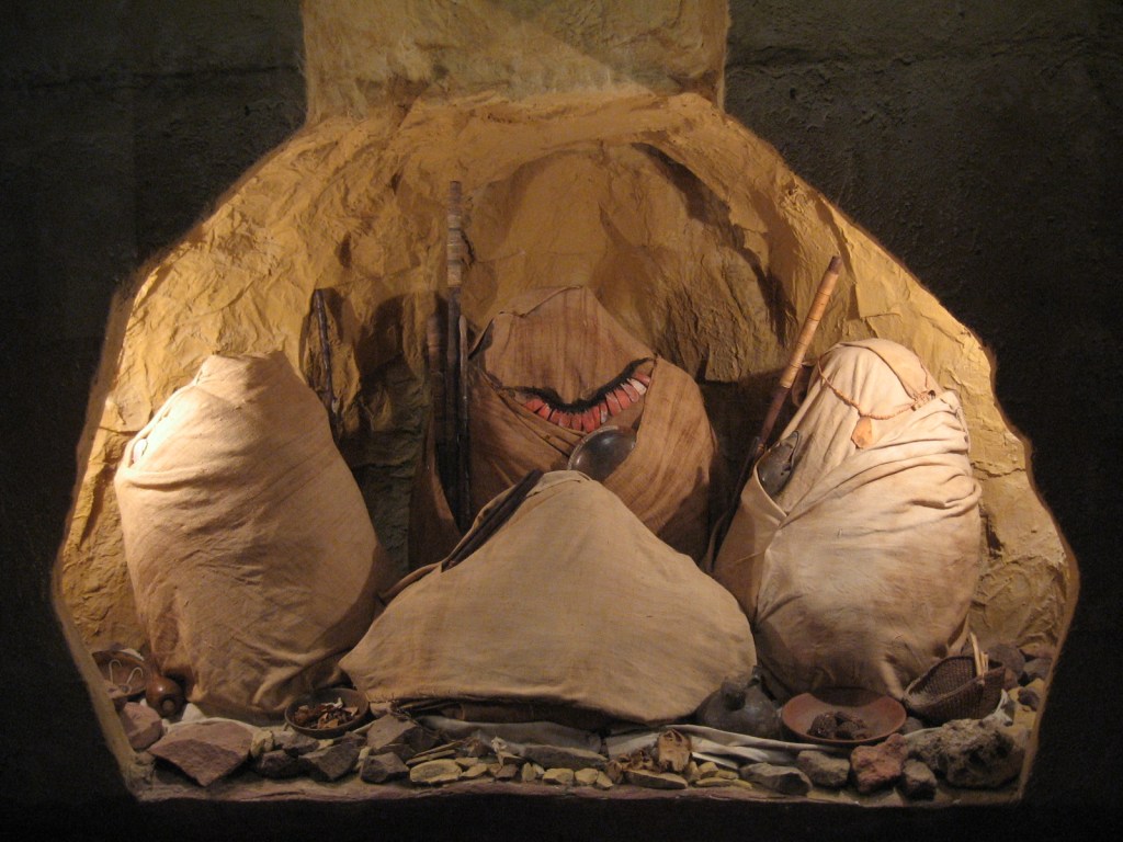 Some of the first indigenous people we know about that settled in Peru were called the Lauricocha. They lived in caves and moved from place to place to hunt for food. About 8,000 years ago, groups like the Telarmachay started to settle down and became some of the world’s first farmers. Instead of just searching for food, they began growing corn and cotton and learned how to raise animals like llamas, alpacas, and even guinea pigs! They also became very talented at making things by hand, like beautiful baskets, warm blankets, and clay pottery.