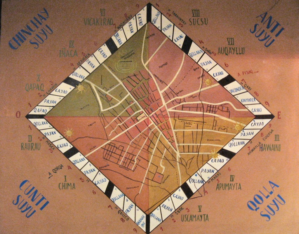 At the heart of everything was the capital city, Qosqo: Cusco (Peruvian spelling) or Cuzco (Spanish spelling). The Inca designed the city’s original layout in the shape of a puma, a sacred animal representing power and the earthly realm. According to the Legend of the Ayar Brothers, the sun god Inti sent four brothers and four sisters—emerging from a cave at Pacaritambo—to find fertile land where a golden staff (a ray of the sun) would sink into the earth. After a long journey marked by betrayal and magical transformations, Manco Cápac and his wife sister Mama Ocllo founded the city and taught the local people the arts of agriculture and weaving.