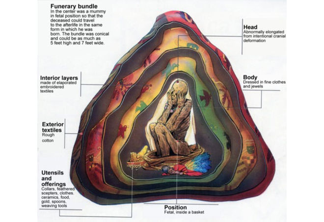 In 1929, the Peruvian archeologist Julio C. Tello unearthed the Paracas Necropolis Wari Kayan, an important site that uncovered 429 mummy bundles, which were unique for the multiple layers of extraordinary woven textiles that enveloped both the body and the grave goods.