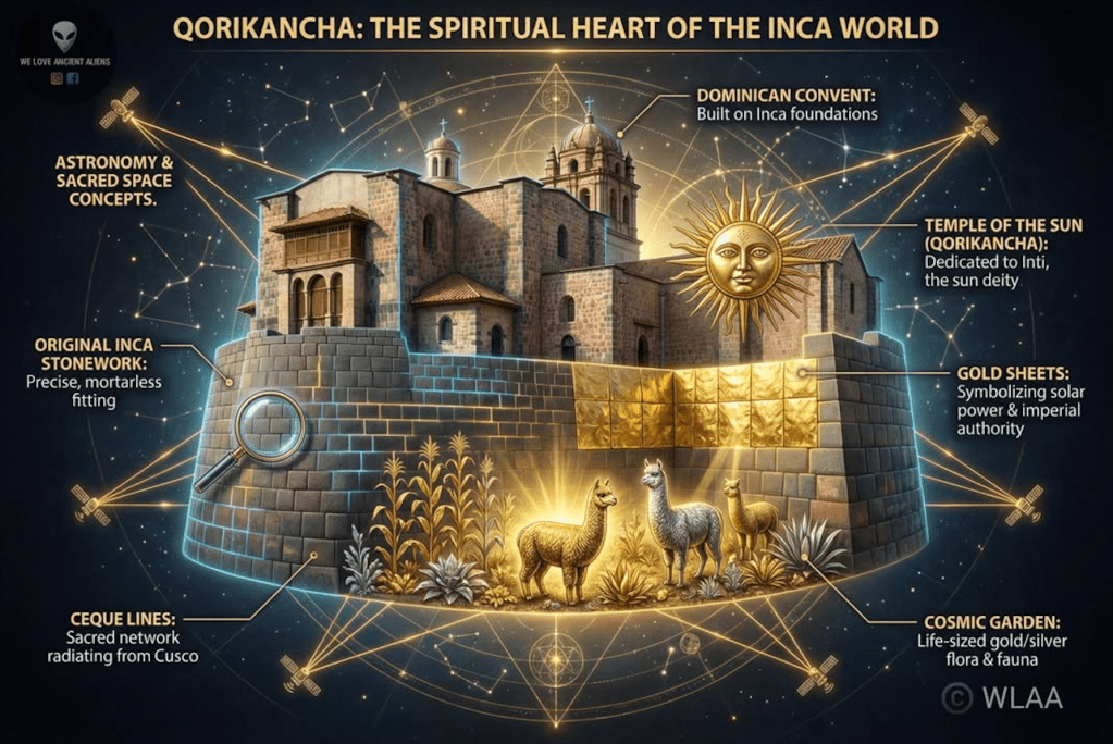 The Qorikancha, or “Golden Enclosure,” was the spiritual heart of the Inca Empire and the most sacred temple in the capital of Cusco. Dedicated primarily to Inti, the Sun God, its interior walls were once covered with over 700 sheets of solid gold, which reflected the sun’s rays to create a blinding, celestial glow. The temple’s masonry represents the absolute pinnacle of Inca stone-cutting, featuring perfectly curved walls of basalt and andesite that have withstood massive earthquakes for centuries.
