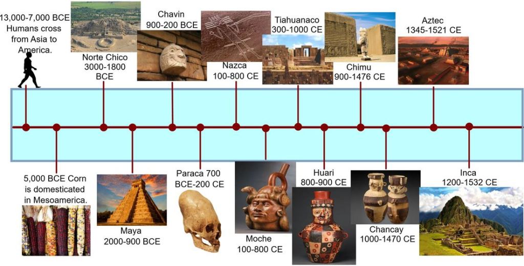 There have been many indigenous peoples that have lived and developed in Peruvian soil. This chart gives one a good idea of some of them and their timeline. Please note that the Maya, and Aztecs are placed in the chart as a reference to other major civilizations in the Americas.