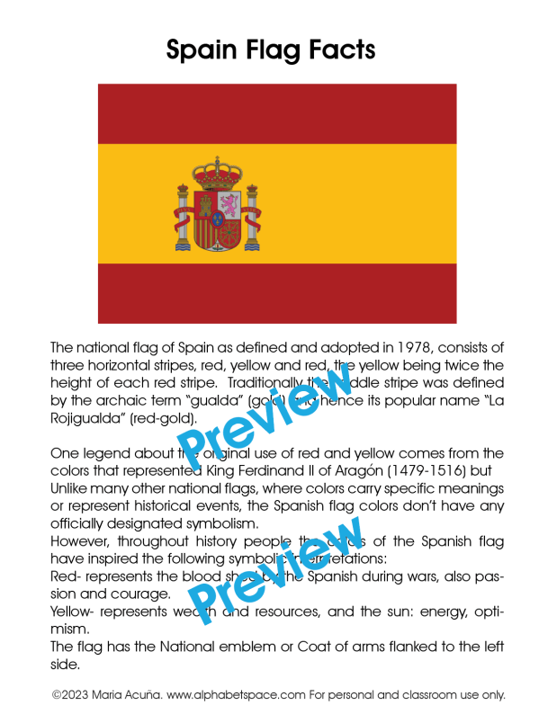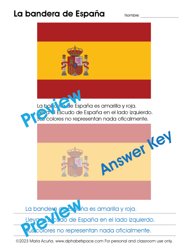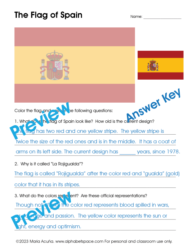 HERE is a packet I created about the flag of Spain that is bilingual and covers information about the flag for any learner from Kindergarten to Middle School. Here you can find the Spanish version of the previous worksheet. I have used it with my students from first and second grade. See the following preview: