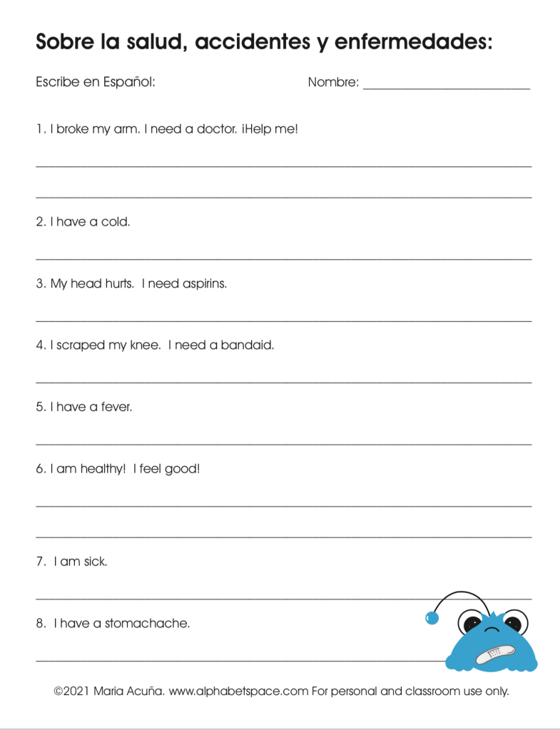My older students learn parts of the body in an unit I call “Salud y Enfermedades” (Health and Sickness). We practice various verb conjugations in saying phrases like “I have a headache” or “My head hurts.” It starts with this vocabulary list that contains a lot of what can happen to children, like knee scrapes,, fevers and broken arms/legs.