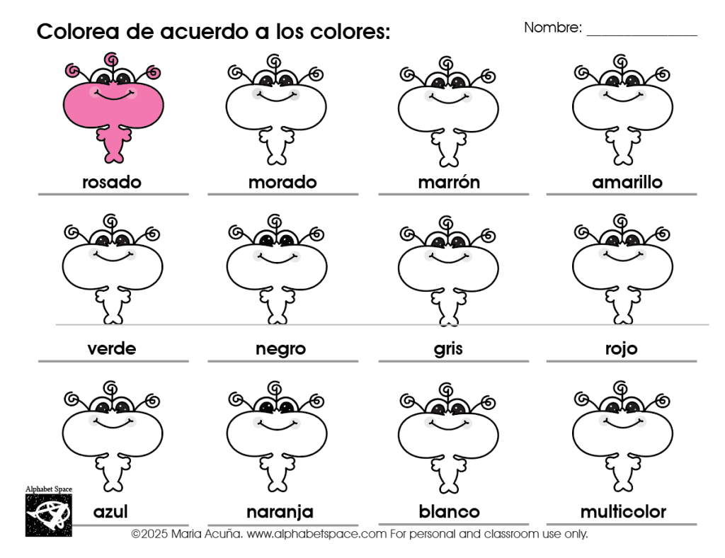 This color chart has the Xluptinos! They are shape shifting creatures from planet Cypxka! This is a fun video with them to practice the colors: