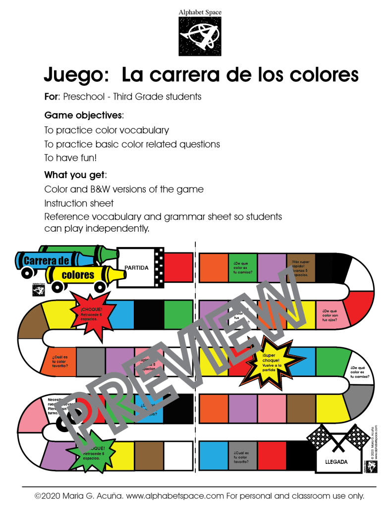 Would you like to get a game to play and practice the colors in Spanish? Check out the game I created below. It is specially designed for children from Preschool to Third Grade.