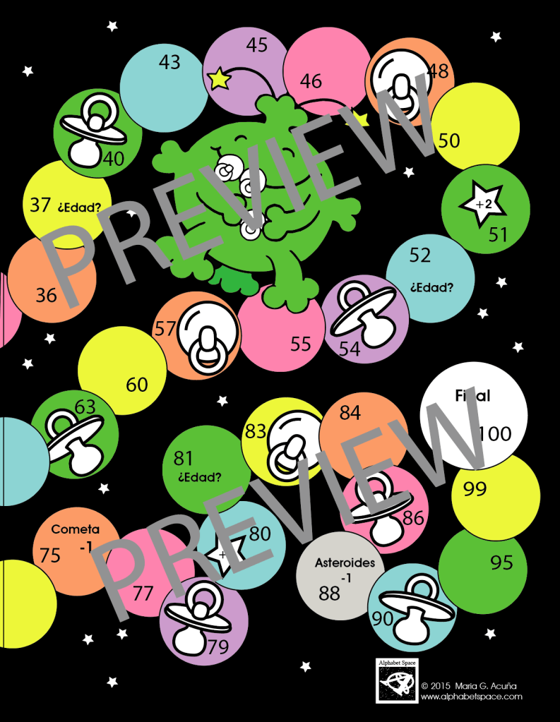 This is a fun board game to practice numbers 0-100. In the game students have a great intergalactic mission: to help an alien pick up pacifiers he dropped in space! ^ ^. It is designed for third grade and up. It is made to be printed in two letter size papers (or cardstock) and played by a group of 4 or 5 students. If needed one can create multiple games to be used with a larger class as it comes with a number game guide, so students can play on their own (while one monitors the simultaneously).