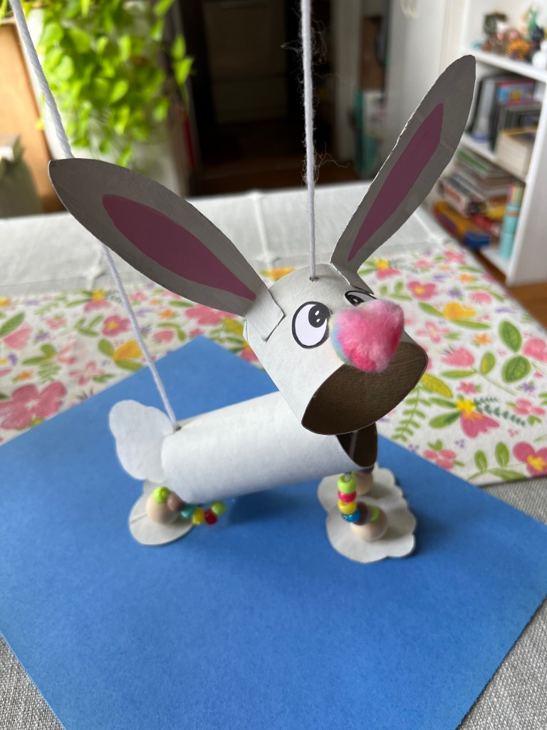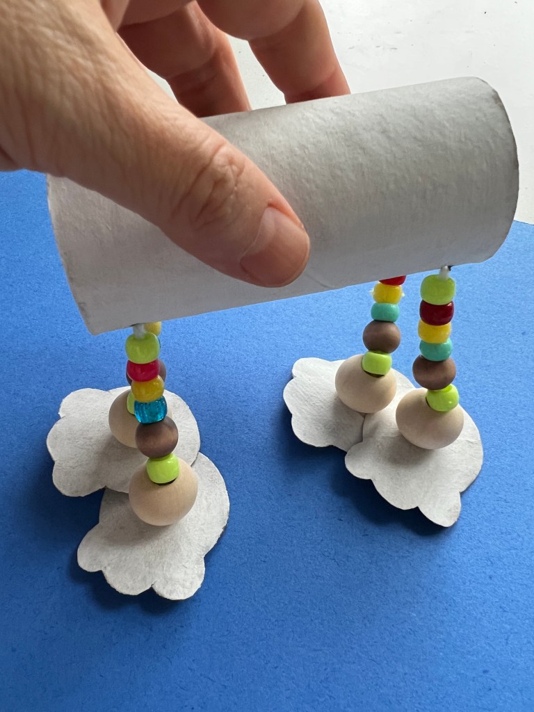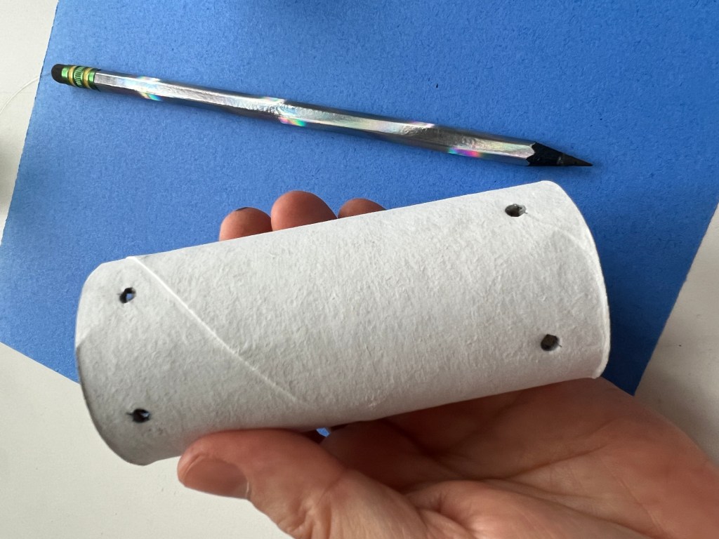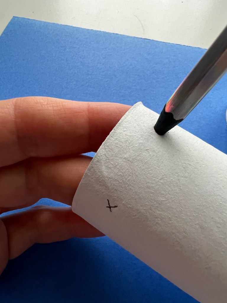 Puncture the “body” paper roll to place the legs. A sharp pencil works. Do the same with the feet.