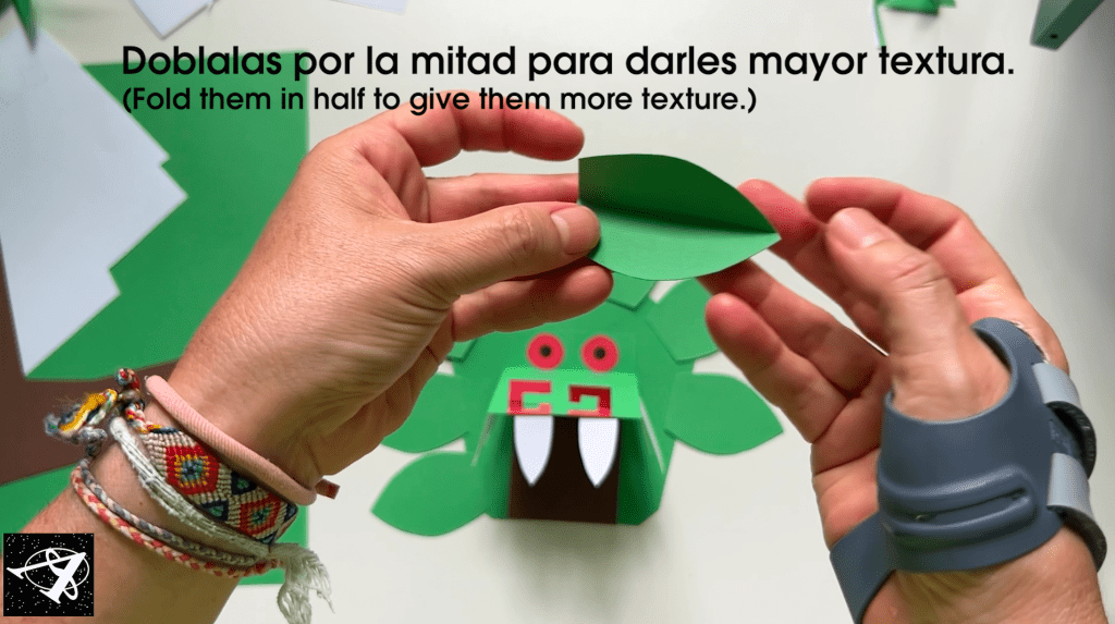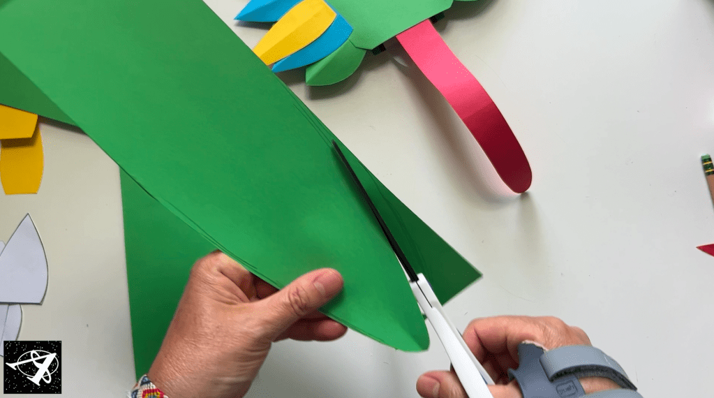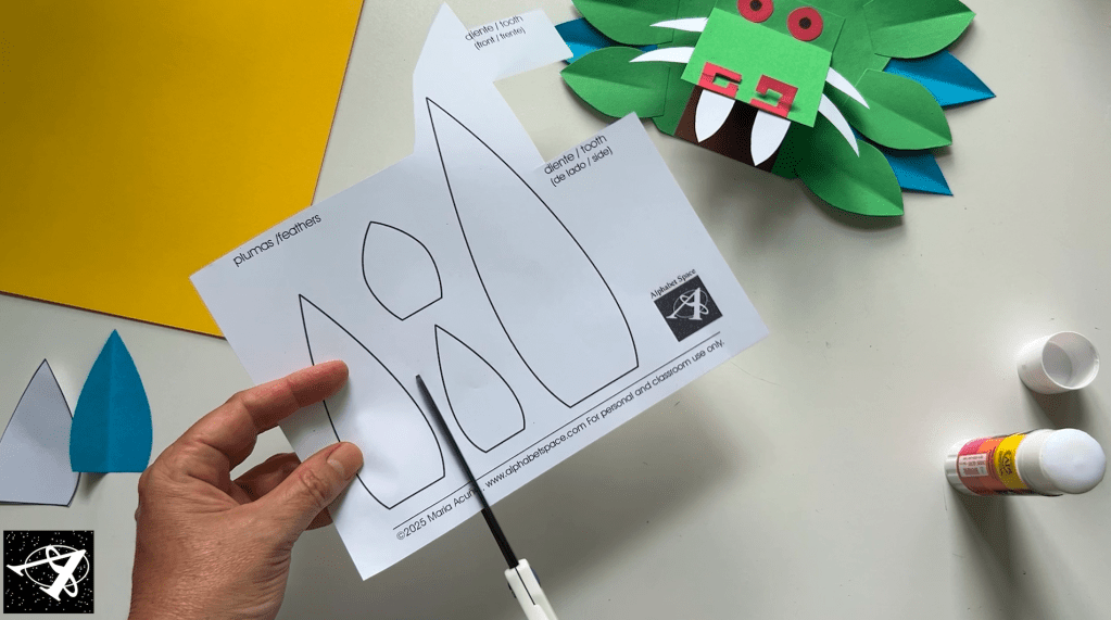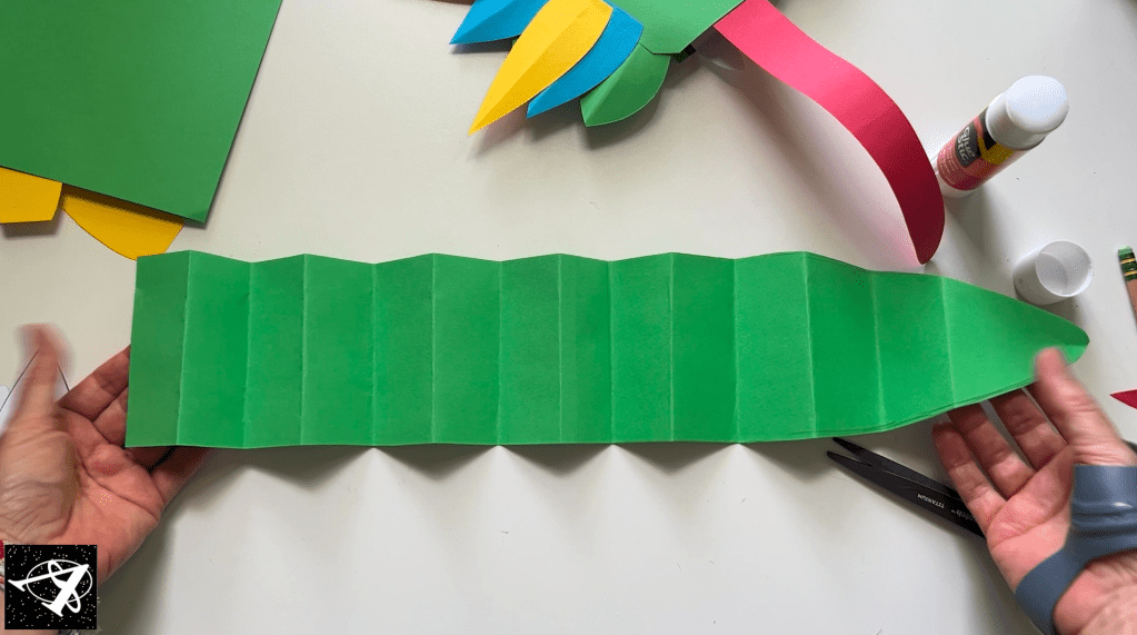 Now we’ll make feathers for its head. We’ll start with the green ones: