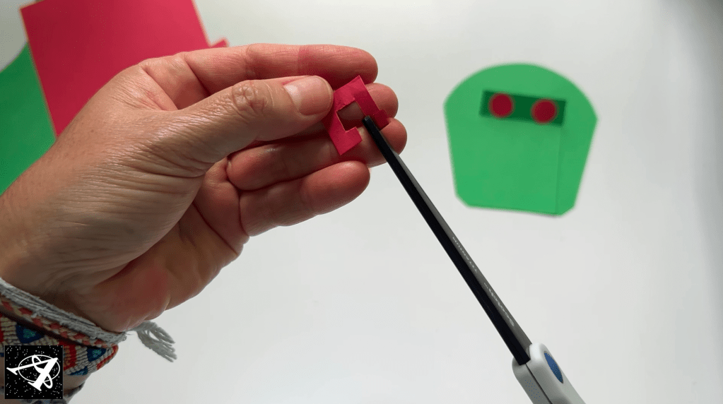 Cut out two eyes and two nostrils (the nose)… if you fold the paper you can get two as you cut: