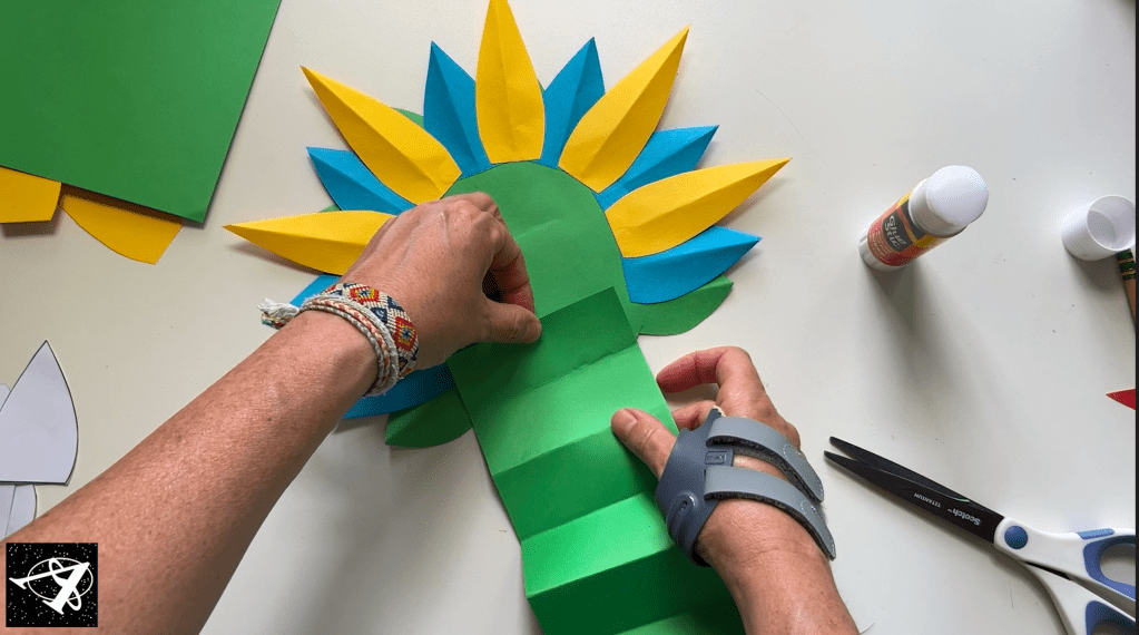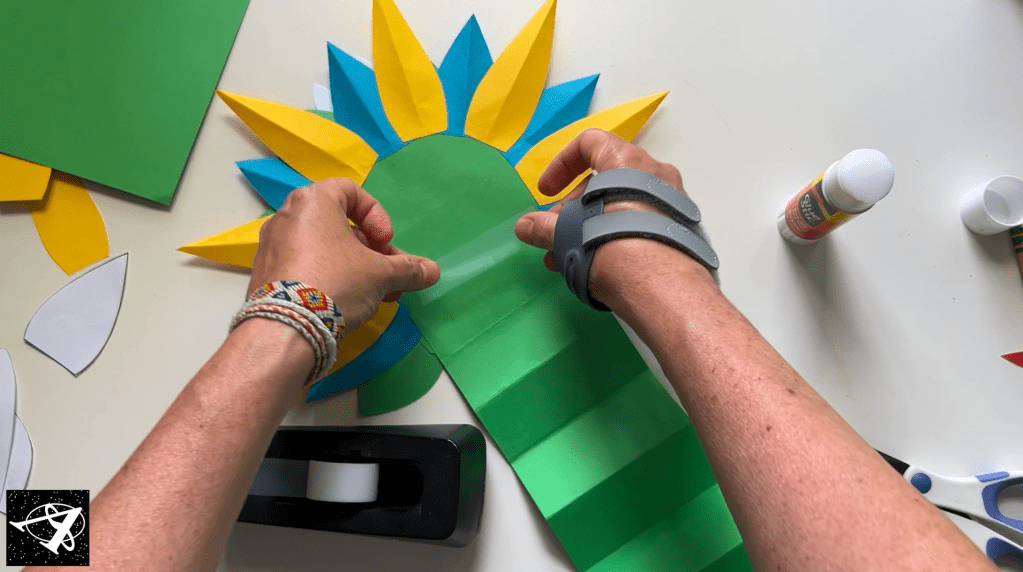 Now we’ll make the second row of feathers: the blue ones. We’ll place them in the back between the green ones so you’ll need 7. Don’t forget to fold them in half for added texture. And count at least to 5 holding them down as you glue so they stick well.