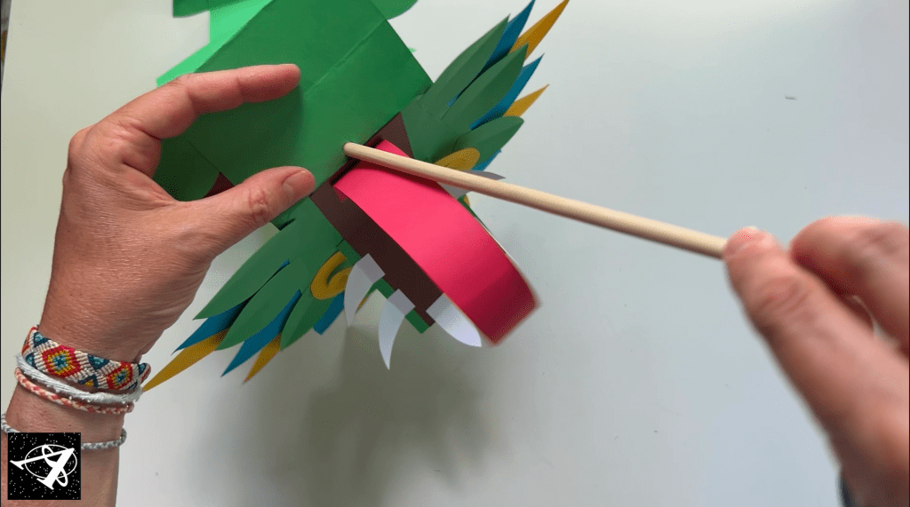 And last, add the stick. Grab a sharpened pencil or a pointed object and make a small hole in the half line of the place between the head and the body. Push the stick through from the front to the back: