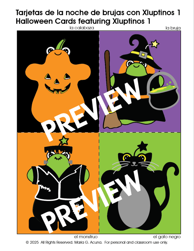 These are the flashcards that I offered in the video. I gave 4 with the Xluptinos, and the rest are for your kids to draw their own creatures! ¡Que se diviertan!… did you know that a hot dog makes a great mummy?