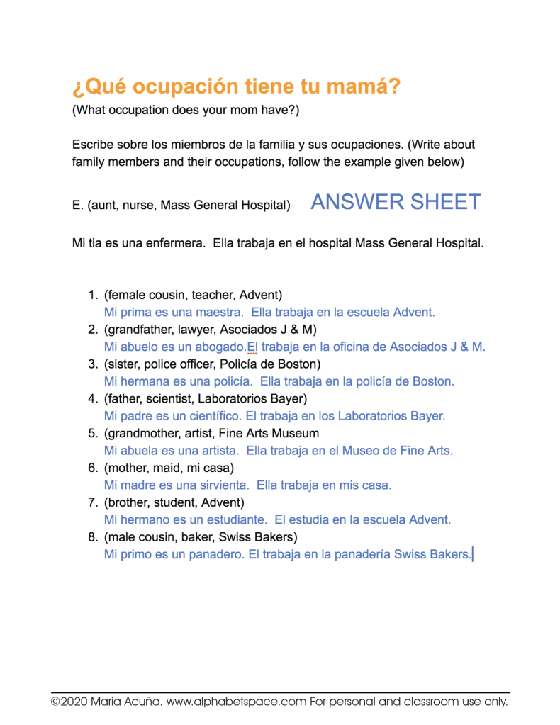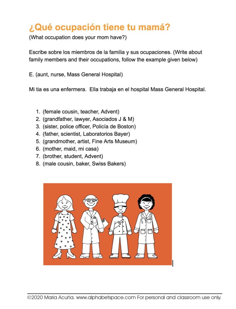 ¡Hola! I created a vocabulary list, a video and worksheets to practice occupations. Further down the Family member vocabulary is also included. These were designed for third-sixth graders in mind. ¡Qué disfruten las actividades!