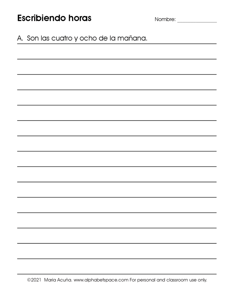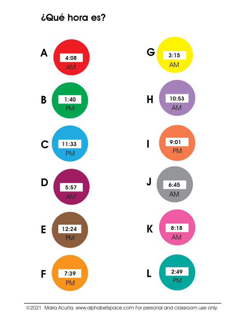 Time telling is a great way not only to learn to tell time in Spanish but also practice numbers from 0-60. In fact I usually start this unit by doing a mini unit on numbers and this helps greatly. Even though analog clocks will probably be a thing of the past soon, I continue to teach to tell time on them. I think this is good for one’s brain , the same as looking for words in a paper dictionary.