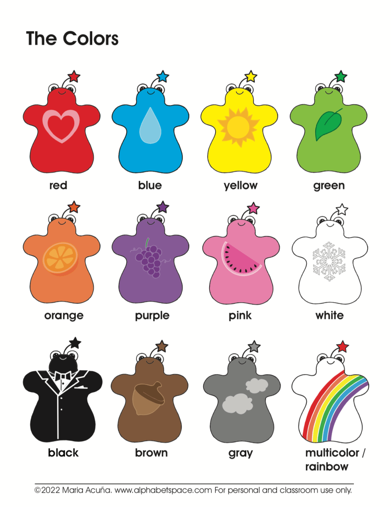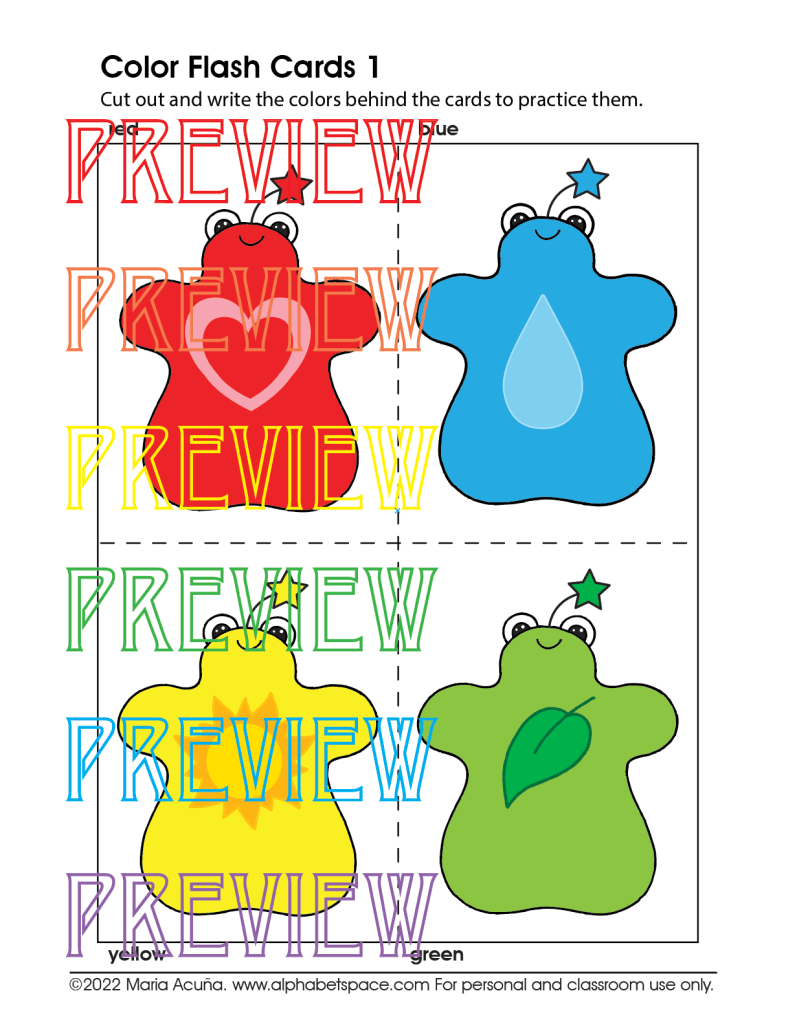 – Flash cards (12 colors including: red, yellow, blue, green, orange, purple, pink, brown, black, white and gray.)