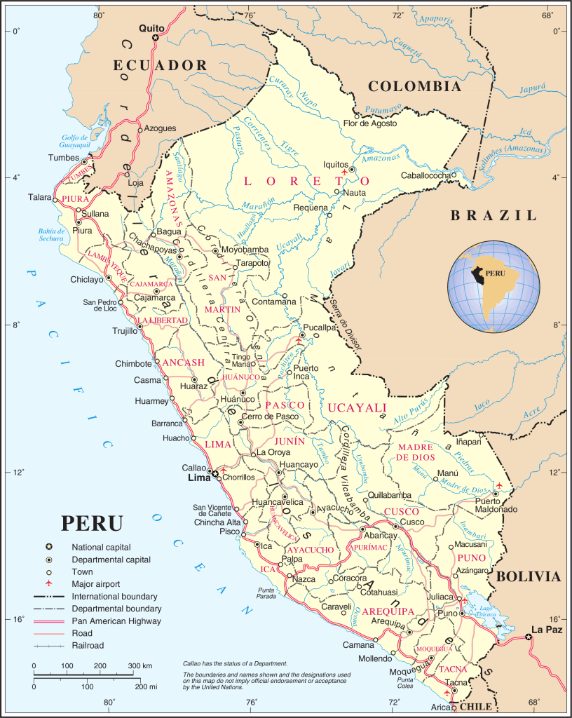 Peru is located in the Western Coast of South America. It is entirely situated in the Southern Hemisphere and faces the Pacific Ocean on the west. Peru is bordered by Ecuador and Colombia to the north, Brazil to the east (the longest border, Bolivia to the Southeast and Chile to the south.