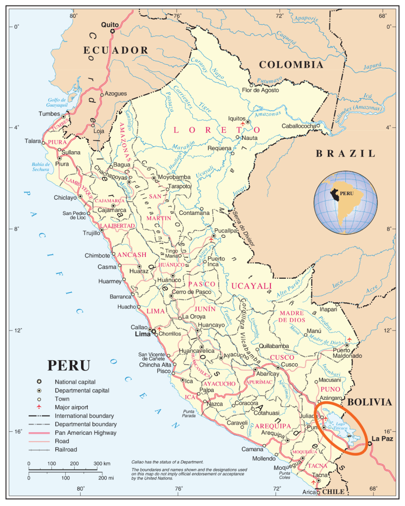 Peru is located in the Western Coast of South America. It is entirely situated in the Southern Hemisphere and faces the Pacific Ocean on the west. Peru is bordered by Ecuador and Colombia to the north, Brazil to the east (the longest border, Bolivia to the Southeast and Chile to the south.