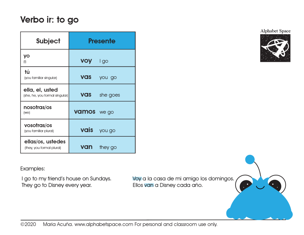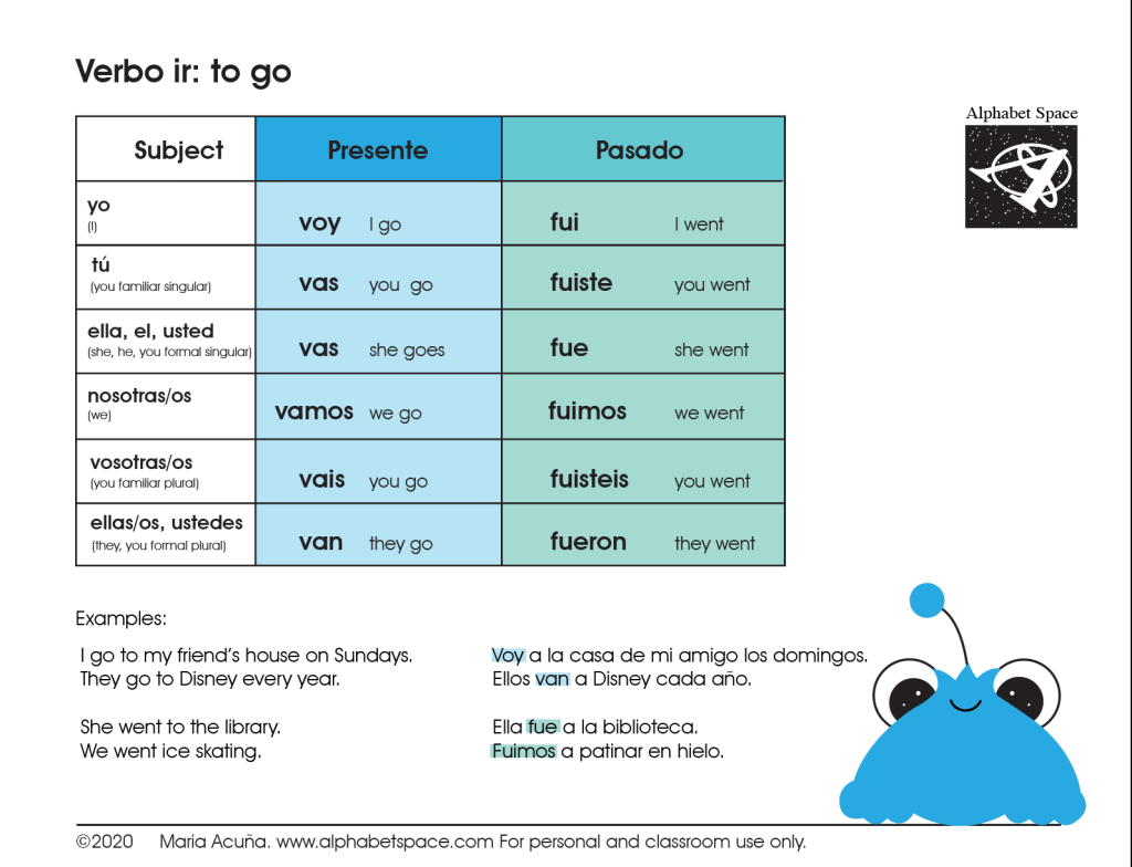¡Hola! Today I created charts of the verb to go for all subjects in the simple present, past and future tenses. I created three different versions: