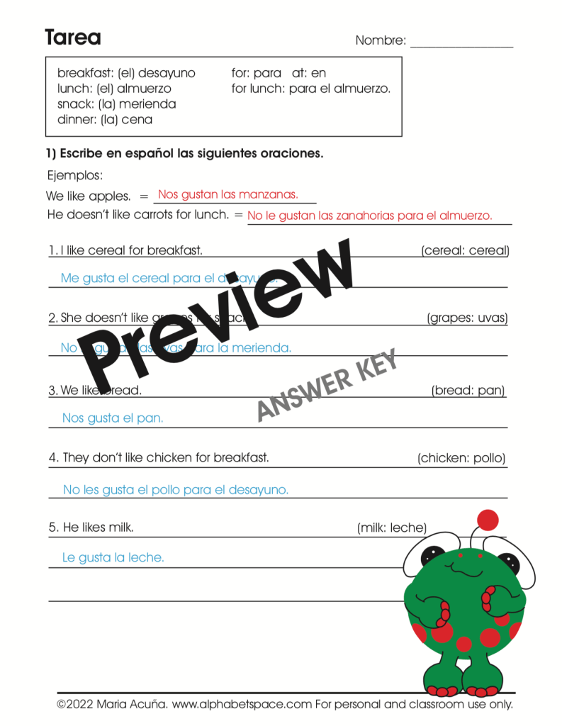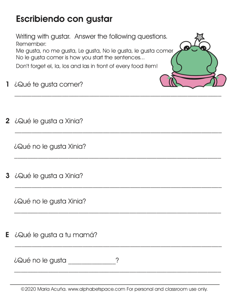 This is a really fun activity. You know how students are always asking each other what they like to eat at lunch time? Well, this is a spin off from that… this is a class food survey! You can do with your class that will allow students to ask their classmates about their food tastes in Spanish. For example a students asks… ¿A quién le gusta comer…? Then, they write the amount of students that liked it and didn’t like it in the especially designed yes/no boxes. As an extension there is another worksheet where students complete sentences about their results and you can have them even practice writing numbers as a bonus!